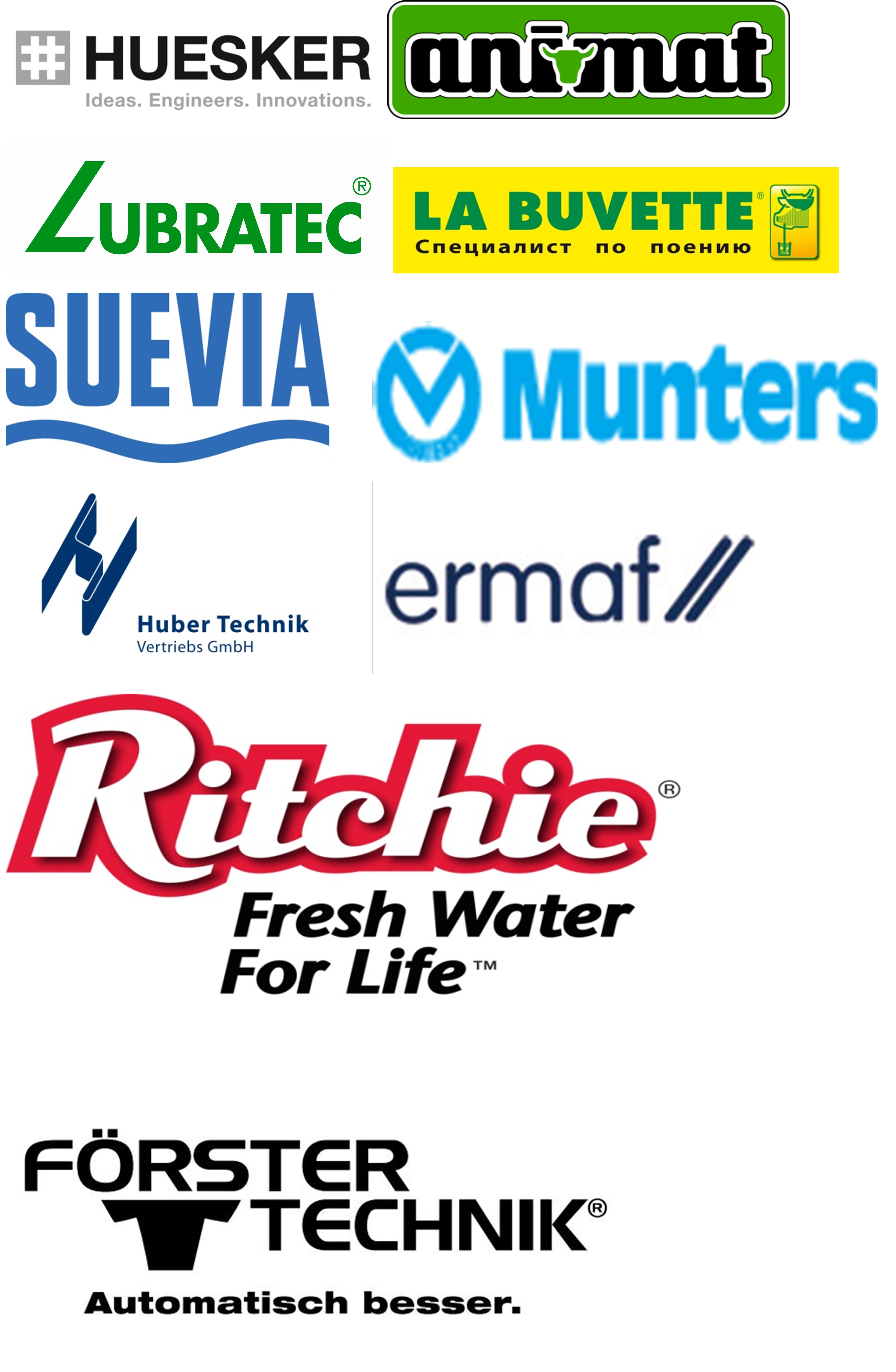 Мы сотрудничаем с такими широко известными в области оборудования для животноводства компаниями как: Egebjerg, Lubing, Ermaf, Big Dutchman, Suevia, La Buvette, Huesker, Förster-Technik GmbH, Beerepoot Agri, Agritech, Landia, Gasolec, Dosatron, Monoflo и многими другими.